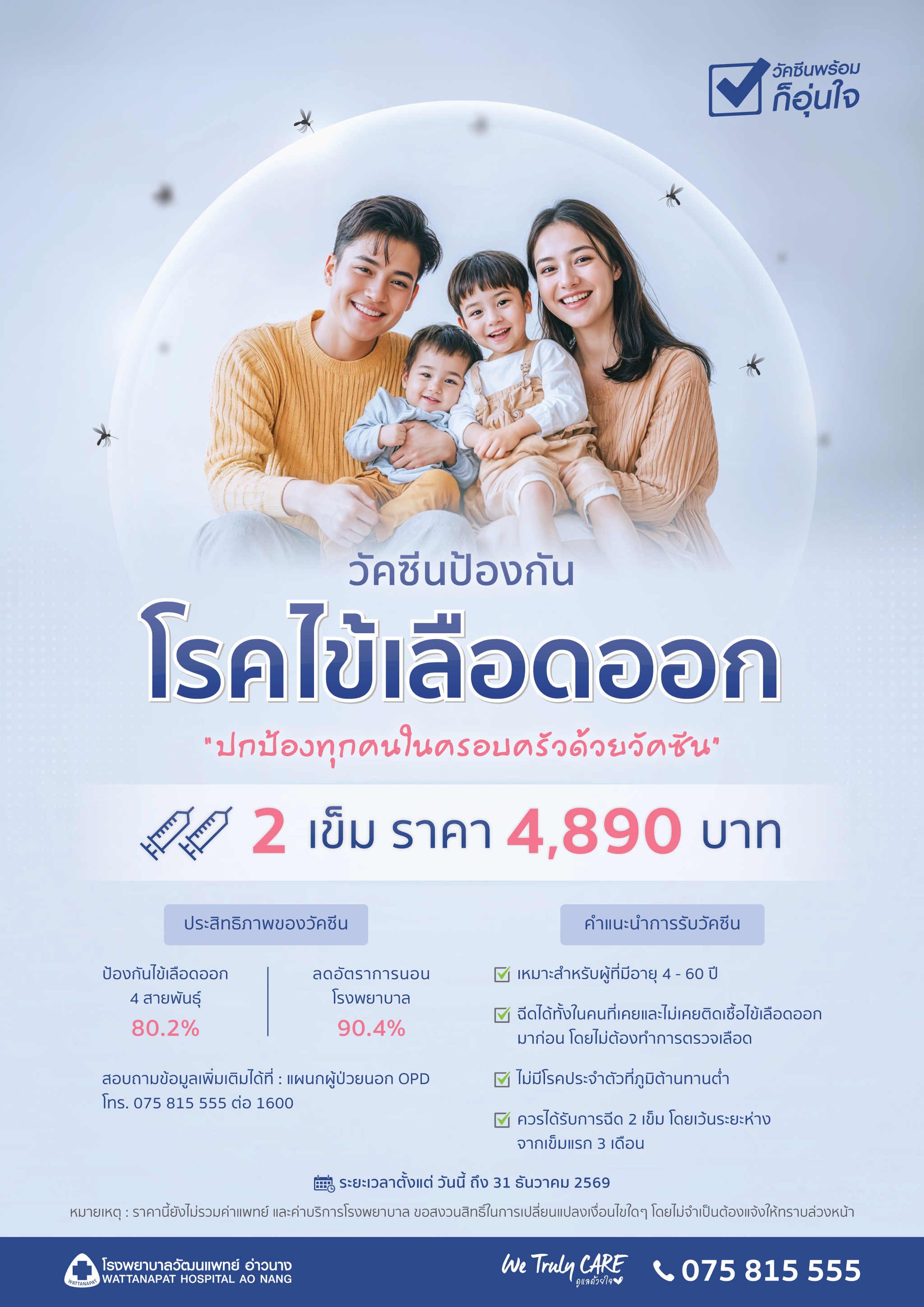 คลินิกวัคซีน พร้อมให้บริการฉีดวัคซีนป้องกันโรคไข้เลือดออก เพื่อเพิ่มภูมิคุ้มกันและลดความรุนแรงของโรค โดยมีแพทย์เฉพาะทางพร้อมทีมสหสาขาวิชาชีพคอยดูแลอย่างใกล้ชิดในทุกความต้องการ