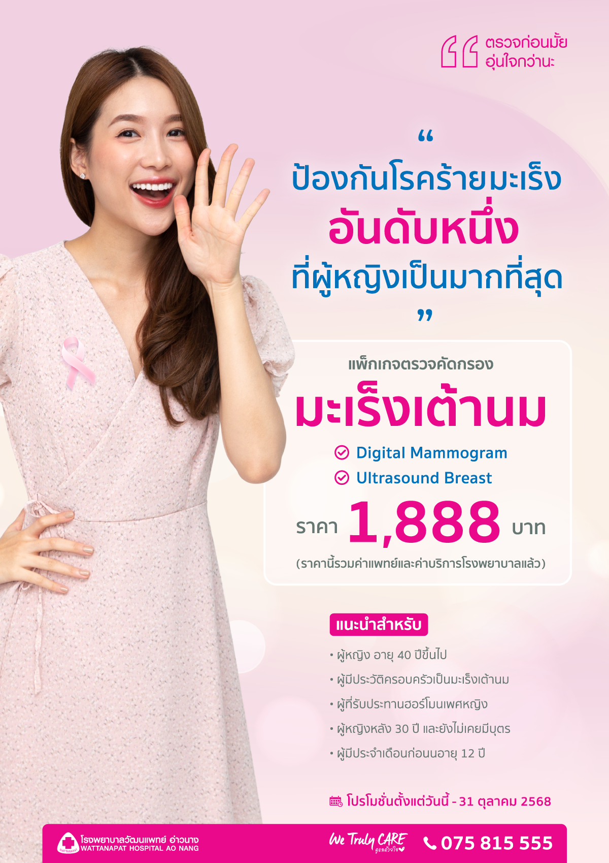 “มะเร็ง” ปัจจุบันถือเป็นโรคที่ร้ายแรงที่สุดโรคหนึ่ง ซึ่งเมื่อเป็นแล้วนั้น โอกาสที่จะรักษาให้หายขาดนั้นเป็นอาจจะเป็นไปได้ หรืออาจจะไม่มีเลย ขึ้นอยู่กับความรุนแรงและตำแหน่งที่เกิดมะเร็ง โดยมะเร็งที่พบมากเป็นอันดับหนึ่งในผู้หญิงไทย คือ มะเร็งเต้านม แม้ว่า “มะเร็งเต้านม” จะเป็นโรคร้ายแรงที่ทำให้เสียชีวิตได้ แต่ผู้หญิงทุกคนสามารถรู้เท่าทันโรคนี้ได้ โดยหมั่นสังเกตบริเวณเต้านมของตนเองในเบื้องต้น ว่ามีสิ่งผิดปกติเกิดขึ้นบ้างหรือเปล่า หากพบอะไรที่น่าสงสัย…อย่าปล่อยทิ้งไว้ ควรรีบมาพบแพทย์โดยเร็วที่สุด