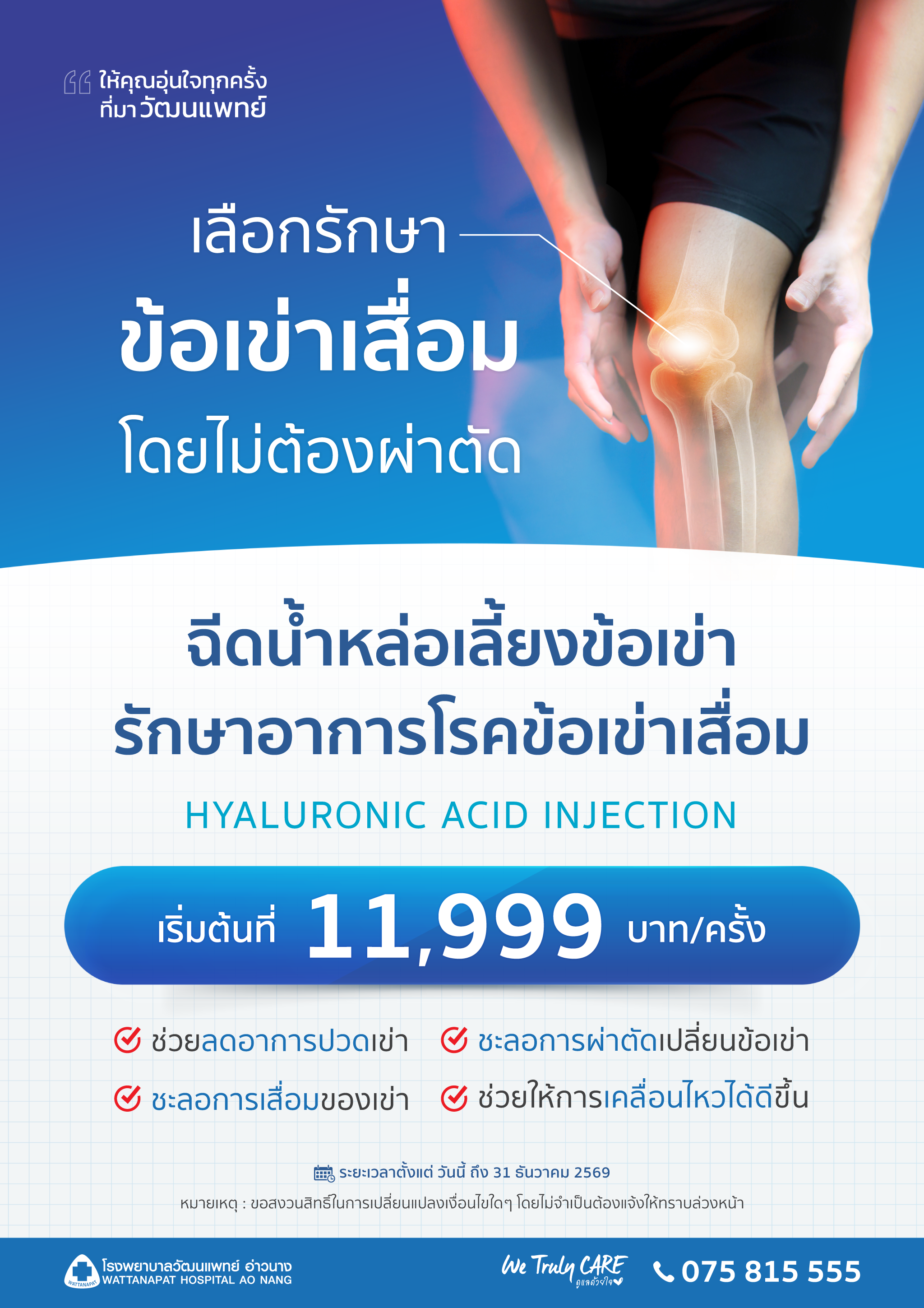 การฉีดน้ำหล่อเลี้ยงข้อเข่า (Hyaluronic Acid Injection) เป็นอีกหนึ่งทางเลือกในการรักษาโรคข้อเข่าเสื่อมโดยไม่ต้องผ่าตัด ช่วยเพิ่มความหล่อลื่นภายในข้อ ลดการเสียดสีของกระดูกอ่อน ทำให้อาการปวดเข่าลดลง และช่วยให้การเคลื่อนไหวดีขึ้น เหมาะสำหรับผู้ที่มีอาการข้อเข่าเสื่อมระยะเริ่มต้นถึงปานกลาง หรือผู้ที่ต้องการชะลอการผ่าตัดเปลี่ยนข้อเข่า การรักษาด้วยวิธีนี้ใช้เวลาไม่นาน ฟื้นตัวเร็ว และสามารถกลับไปใช้ชีวิตประจำวันได้ตามปกติ ภายใต้การดูแลของแพทย์เฉพาะทาง เพื่อให้ผู้ป่วยกลับมาเคลื่อนไหวได้อย่างมั่นใจและมีคุณภาพชีวิตที่ดีขึ้นอีกครั้ง