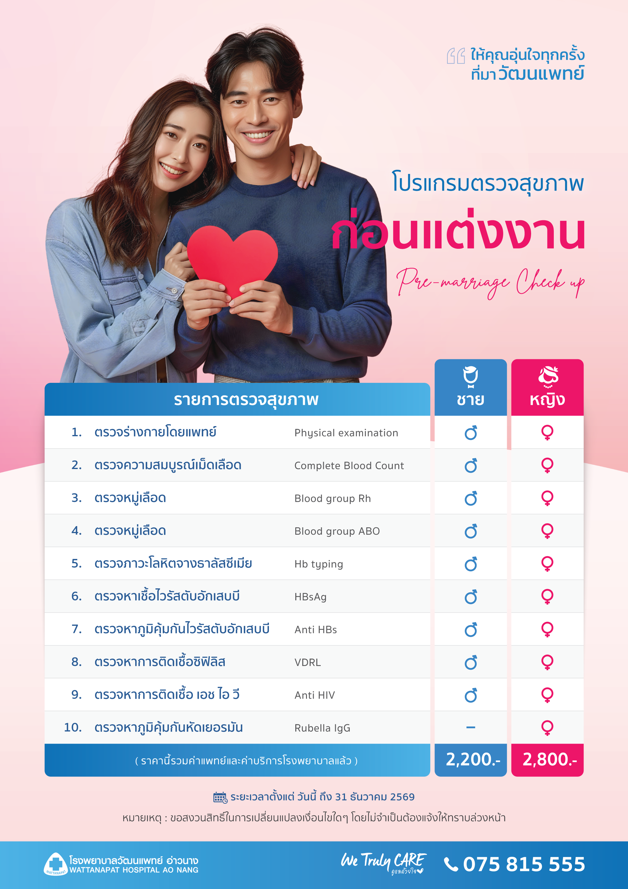 สำหรับ "การตรวจสุขภาพก่อนแต่งงาน"นอกจากจะมีการตรวจสุขภาพพื้นฐานแล้ว ยังมีรายการตรวจเพิ่มเติม เช่น การตรวจหาความเสี่ยงโรคติดต่อทางเพศสัมพันธ์ การตรวจหาความผิดปกติที่เกี่ยวข้องกับพันธุกรรมที่อาจจะส่งผลต่อการมีบุตรในอนาคต เพื่อการวางแผนการใช้ชีวิตคู่และการมีบุตรอย่างปลอดภัยไร้กังวล