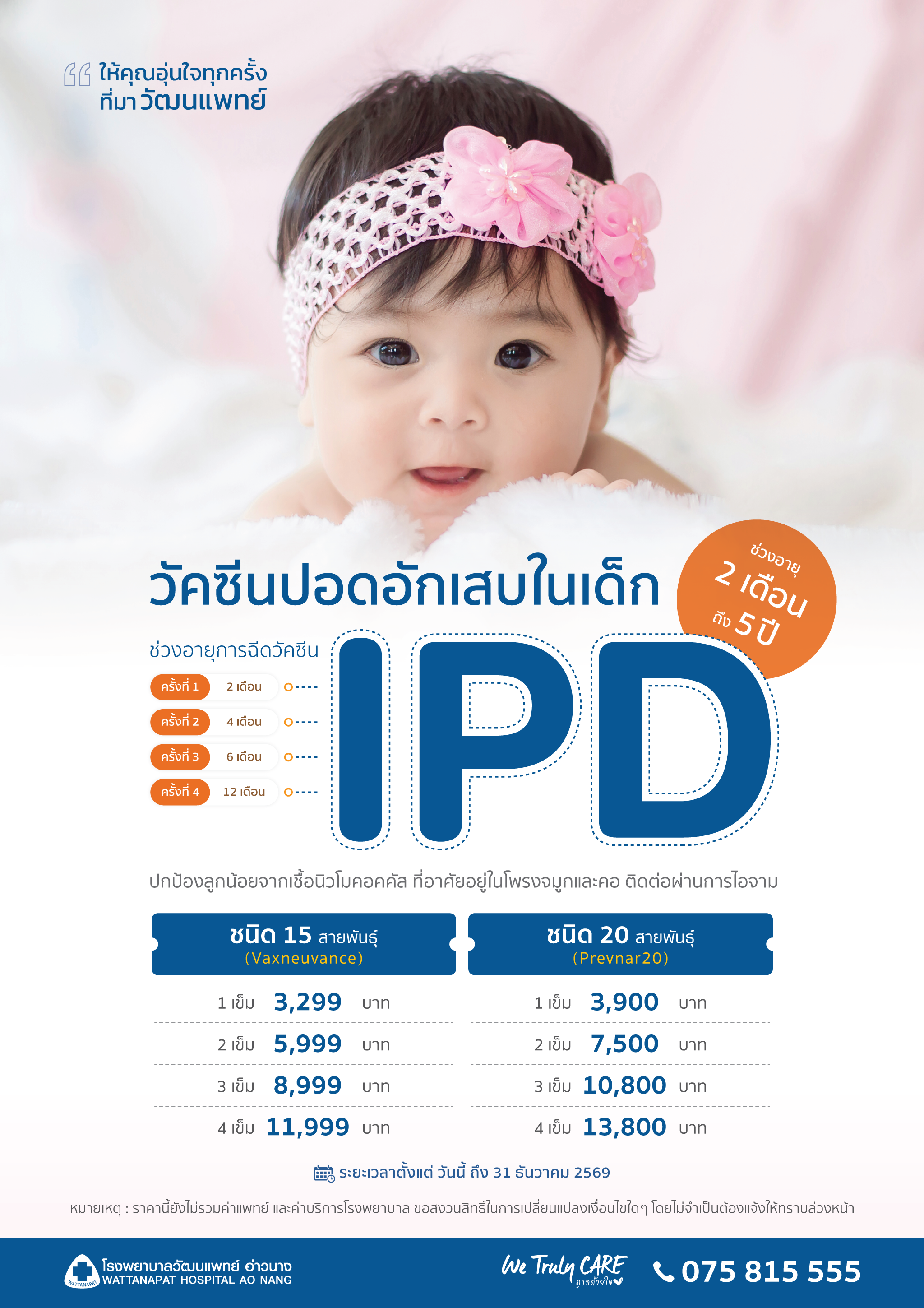 โรคไอพีดี (IPD, Invasive Pneumococcal Disease) คือโรคติดเชื้อชนิดรุนแรง ซึ่งเกิดจากแบคทีเรียที่มีชื่อว่า นิวโมคอคคัส สามารถทำให้เกิดการติดเชื้อในกระแสเลือด เยื่อหุ้มสมองอักเสบ ปอดอักเสบรุนแรง ไปจนถึงทำให้พิการและเสียชีวิตได้ เราสามารถป้องกันร่างกายลูกน้อยจากเชื้อเหล่านี้ได้ด้วยการฉีด วัคซีน IPD ซึ่งไอพีดี ประกอบด้วยโรคสำคัญ 2 โรค ได้แก่ โรคเยื่อหุ้มสมองอักเสบ และ โรคติดเชื้อในกระแสเลือด บางครั้งอาจรวมถึง โรคปอดบวม ที่มีการติดเชื้อในกระแสเลือดร่วมด้วย การติดเชื้อนิวโมคอคคัสที่ไม่รุนแรงในเบื้องต้นก็ยังอาจก่อให้เกิดโรคหูชั้นกลางอักเสบ (หูน้ำหนวก) และ โรคไซนัสอักเสบได้ หากได้รับการรักษาที่ไม่ถูกต้องอาจทำให้เชื้ออาจลุกลามไปยังอวัยวะข้างเคียงหรือสมองได้เช่นกัน