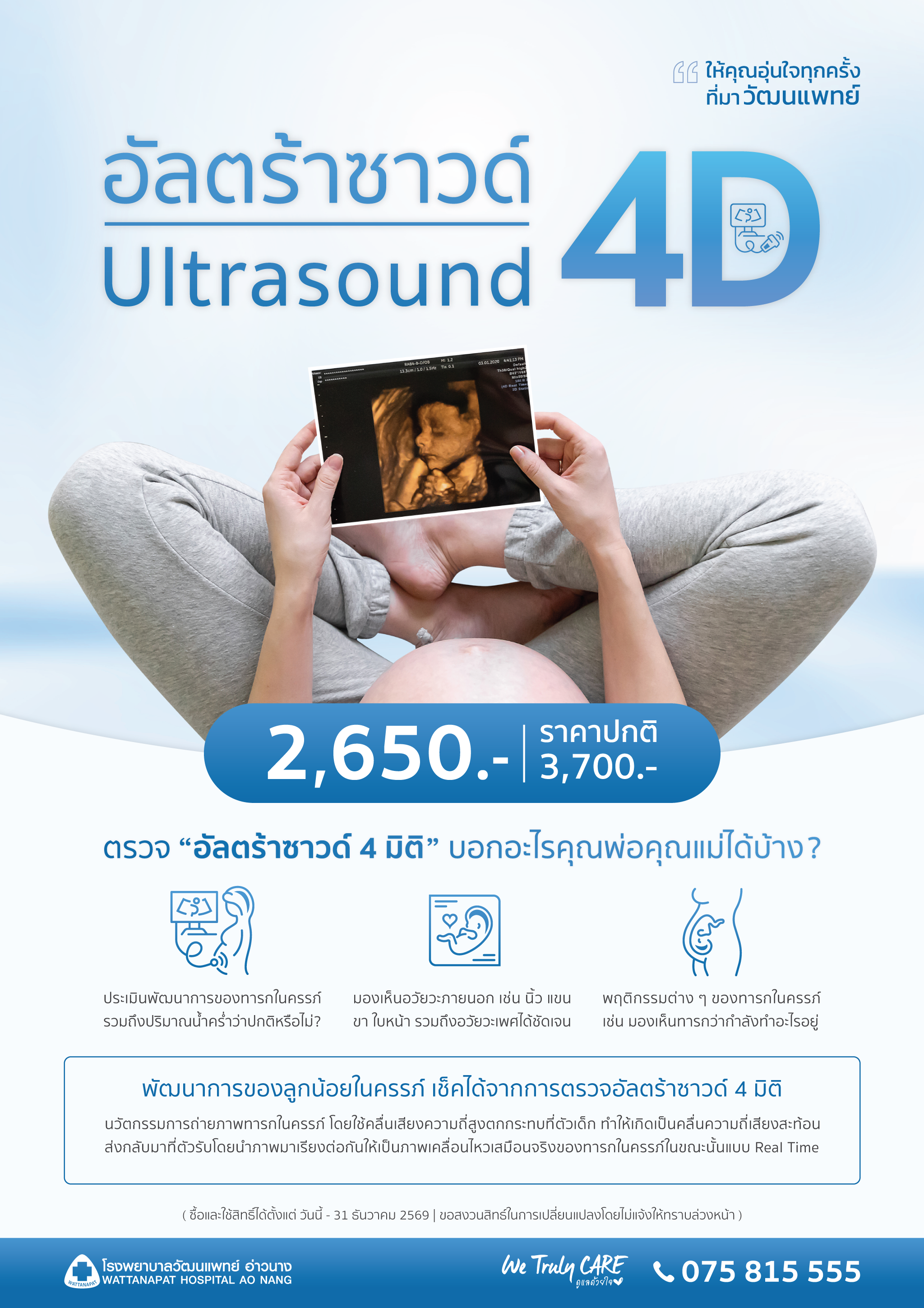 อัลตราซาวด์ 4 มิติ เป็นนวัตกรรมใหม่ในการตรวจอัลตราซาวด์ลูกน้อยในครรภ์ โดยเป็นการนำภาพนิ่งมาเรียงต่อกันให้เป็นภาพเคลื่อนไหวเสมือนจริงโดยใช้คลื่นเสียง (Ultrasound) ทำให้ภาพที่เรามองเห็นผ่านหน้าจอเป็นภาพที่ถ่ายออกมาดูสมจริงและเป็นปัจจุบัน (Real-time) เทคโนโลยีอัลตราซาวด์ 4 มิติ สามารถทำให้เราทราบได้ว่าพฤติกรรมของลูกน้อยในครรภ์เป็นอย่างไร และสามารถเห็นการเคลื่อนไหวต่างๆ เช่น ยิ้ม ลืมตา อ้าปาก หาวนอน ดูดนิ้ว ได้อย่างชัดเจน