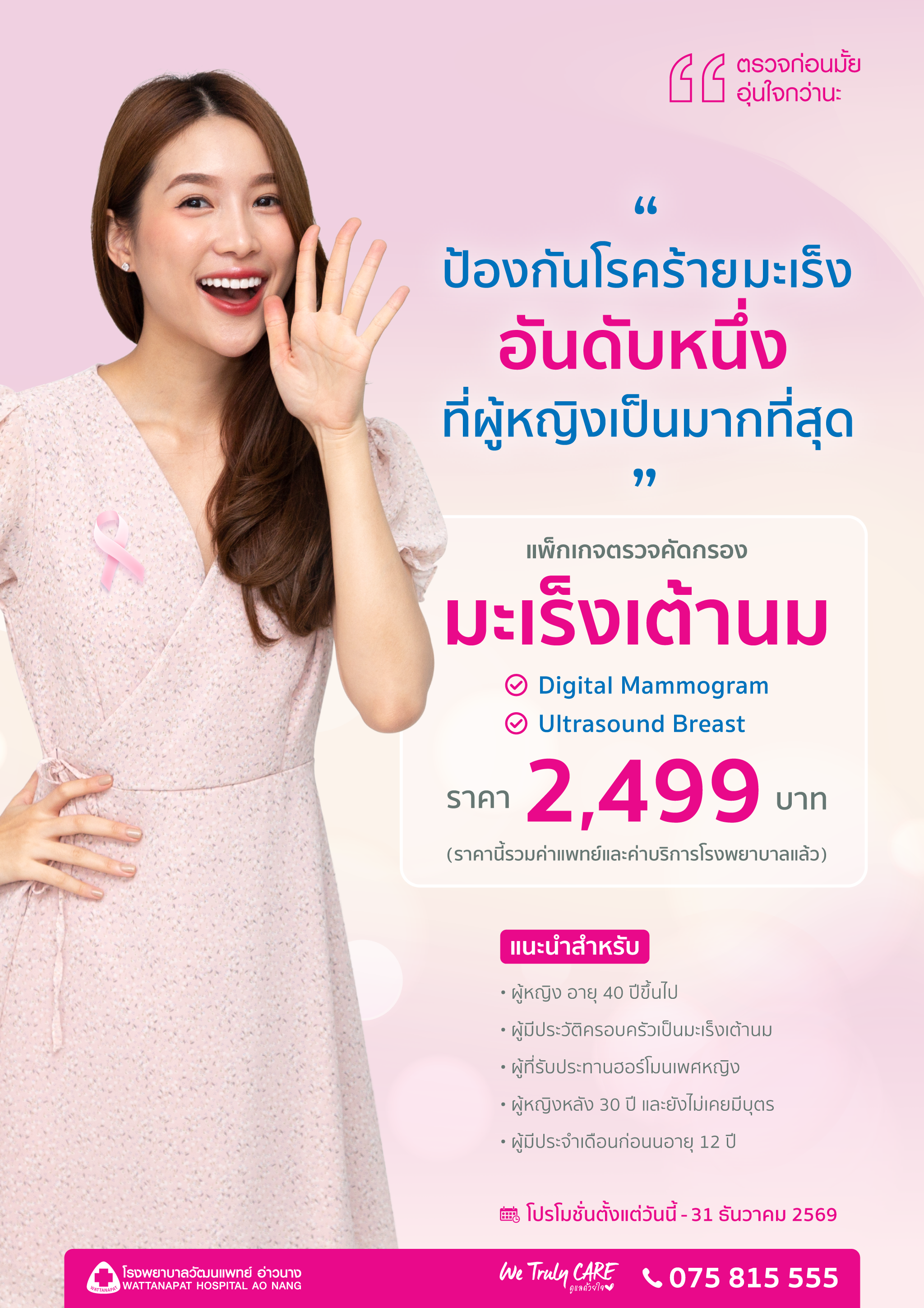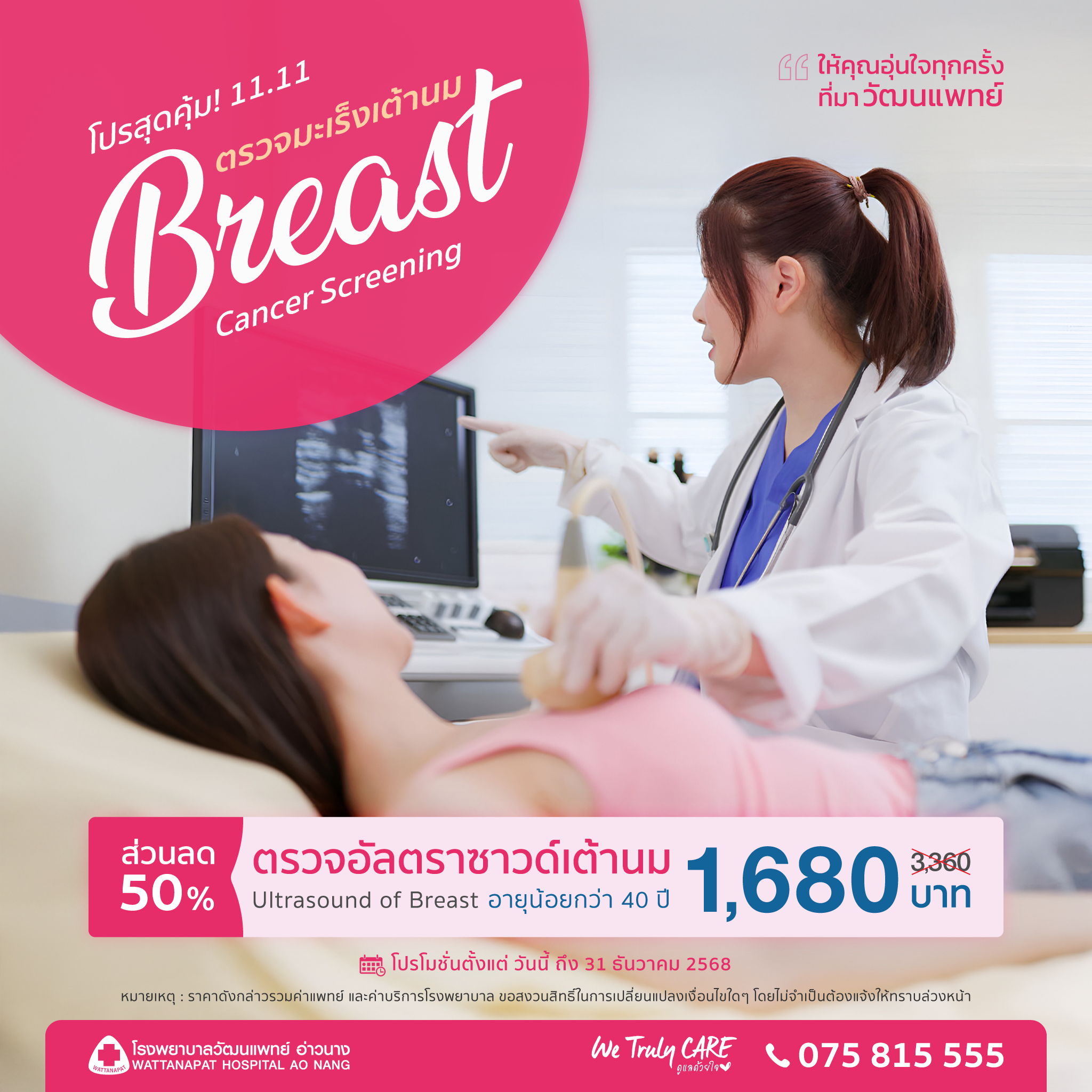 การตรวจอัลตร้าซาวด์เต้านม (Ultrasound for Breast) เป็นวิธีตรวจที่ใช้คลื่นเสียงความถี่สูง เพื่อตรวจหาความผิดปกติภายในเต้านม เช่น ก้อนเนื้อ ซีสต์ หรือภาวะที่สงสัยว่าอาจเป็นมะเร็งเต้านม เหมาะอย่างยิ่งสำหรับผู้หญิงอายุต่ำกว่า 40 ปี ที่มีเนื้อเต้านมหนาแน่น รวมถึงหญิงตั้งครรภ์ หรือผู้ที่ไม่สามารถเอกซเรย์แมมโมแกรมได้ การตรวจนี้ไม่เจ็บ ไม่ต้องฉีดสี และไม่ใช้รังสี ช่วยให้แพทย์เห็นภาพเนื้อเยื่อภายในได้อย่างละเอียด สามารถตรวจร่วมกับแมมโมแกรมเพื่อเพิ่มความแม่นยำในการวินิจฉัย และช่วยให้รักษาโรคเต้านมได้อย่างทันท่วงที เพิ่มโอกาสในการหายขาด