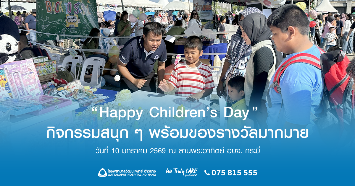 โรงพยาบาลวัฒนแพทย์ อ่าวนาง ขอร่วมเป็นส่วนหนึ่งในการสร้างรอยยิ้มและความสุขให้กับน้อง ๆ ในโอกาส วันเด็กแห่งชาติ ประจำปี 2569 ขอขอบคุณเด็ก ๆ และครอบครัวที่มาร่วมสนุกกับกิจกรรมสุดเพลินจากบูธของโรงพยาบาล ภายในงานมีกิจกรรมสร้างสรรค์มากมาย พร้อมของรางวัลน่ารัก ๆ แจกให้น้อง ๆ อย่างจุใจ เสริมทั้งความสนุกและสาระด้านสุขภาพไปพร้อมกัน เมื่อในวันเสาร์ที่ 10 มกราคม 2569 เวลา 08.00–15.00 น. ณ ลานพระอาทิตย์ องค์การบริหารส่วนจังหวัดกระบี่