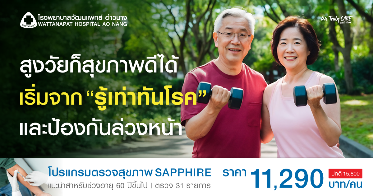 และที่สำคัญ อย่าลืมเข้ารับการตรวจสุขภาพประจำปี เพื่อค้นหาความเสี่ยงตั้งแต่ต้น ที่ โรงพยาบาลวัฒนแพทย์ อ่าวนาง เราพร้อมดูแลผู้สูงอายุอย่างครบวงจรด้วยทีมแพทย์เฉพาะทางและเทคโนโลยีทางการแพทย์ที่ทันสมัย เพื่อให้คุณและครอบครัวมั่นใจได้ว่า สุขภาพดีในวัยเกษียณสามารถสร้างได้ตั้งแต่วันนี้