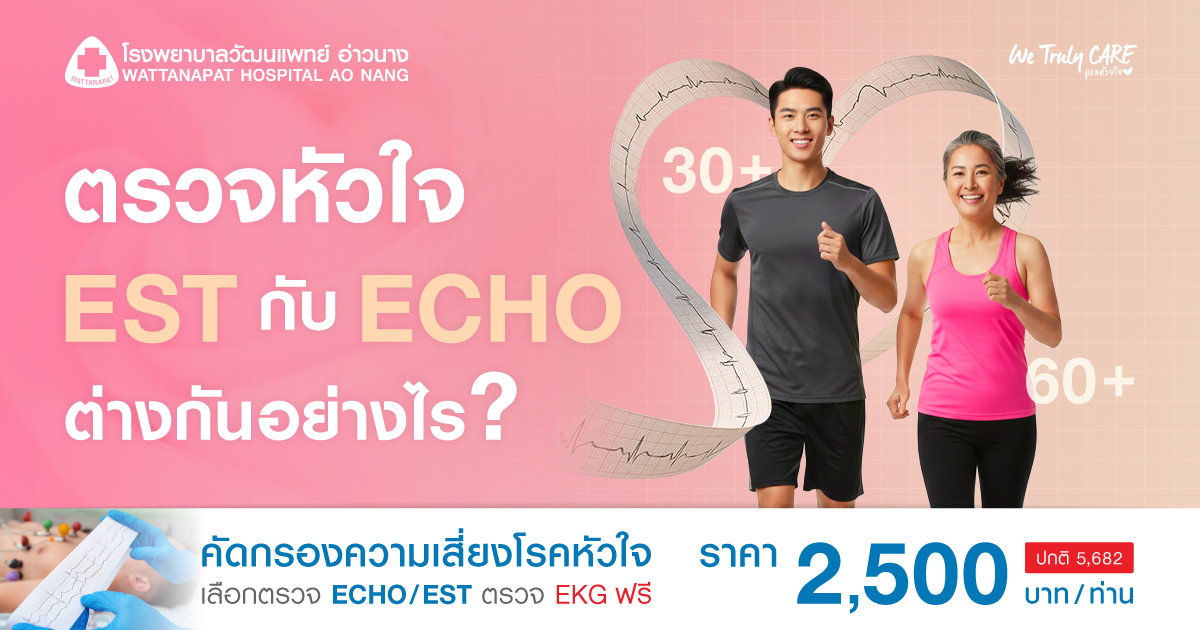 โรคหัวใจเป็นหนึ่งในสาเหตุการเสียชีวิตอันดับต้น ๆ ของคนไทย การตรวจหัวใจอย่างสม่ำเสมอจึงมีความสำคัญอย่างยิ่ง โดยเฉพาะในผู้ที่มีปัจจัยเสี่ยง เช่น ความดันโลหิตสูง เบาหวาน ไขมันในเลือดสูง สูบบุหรี่ หรือมีประวัติคนในครอบครัวเป็นโรคหัวใจ การตรวจหัวใจที่หลายคนคุ้นเคยกันดี คือ EST และ ECHO แต่หลายคนอาจยังไม่ทราบว่าทั้งสองวิธีนี้แตกต่างกันอย่างไร บทความนี้จะอธิบายให้เข้าใจแบบง่ายๆ