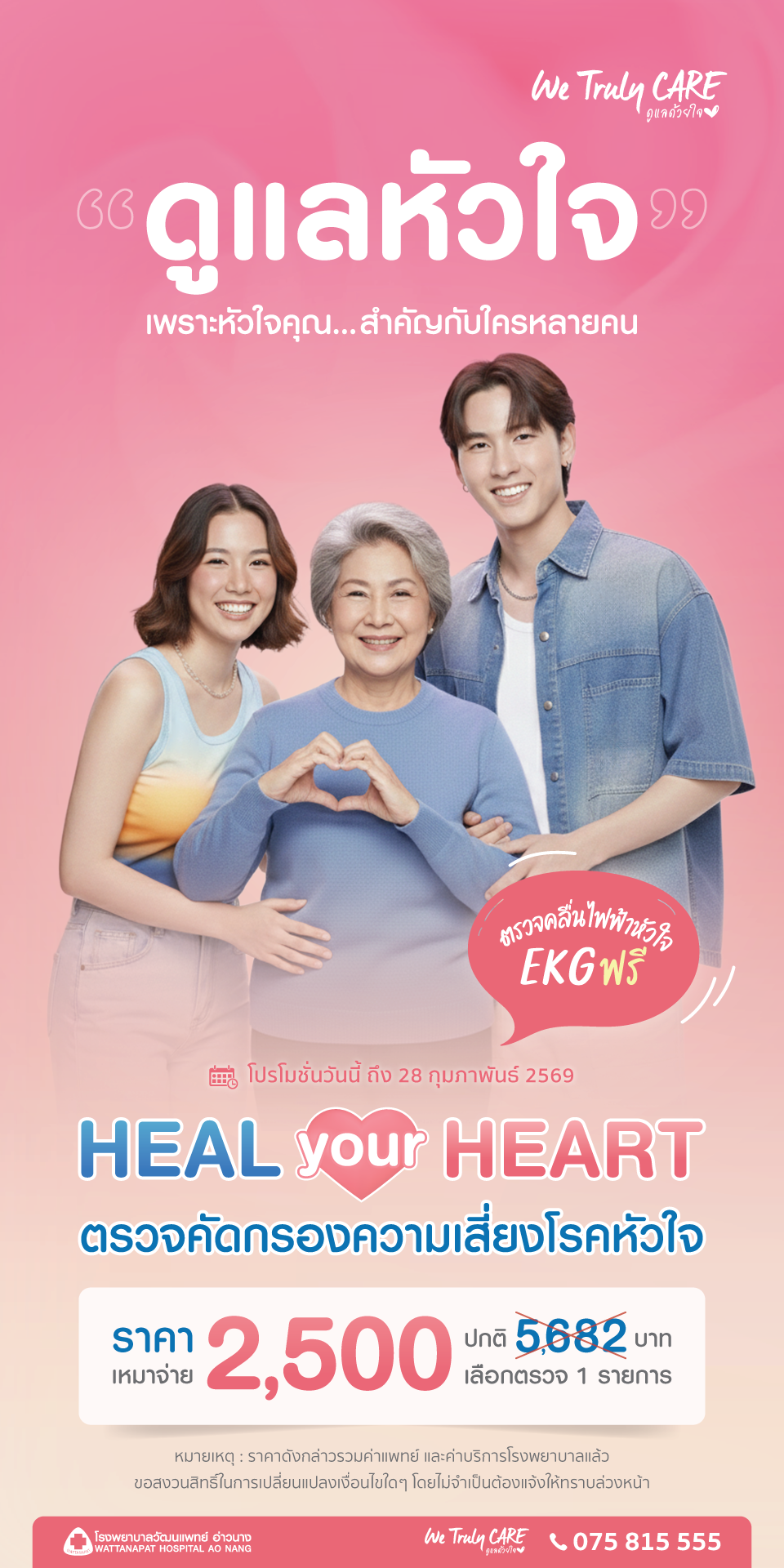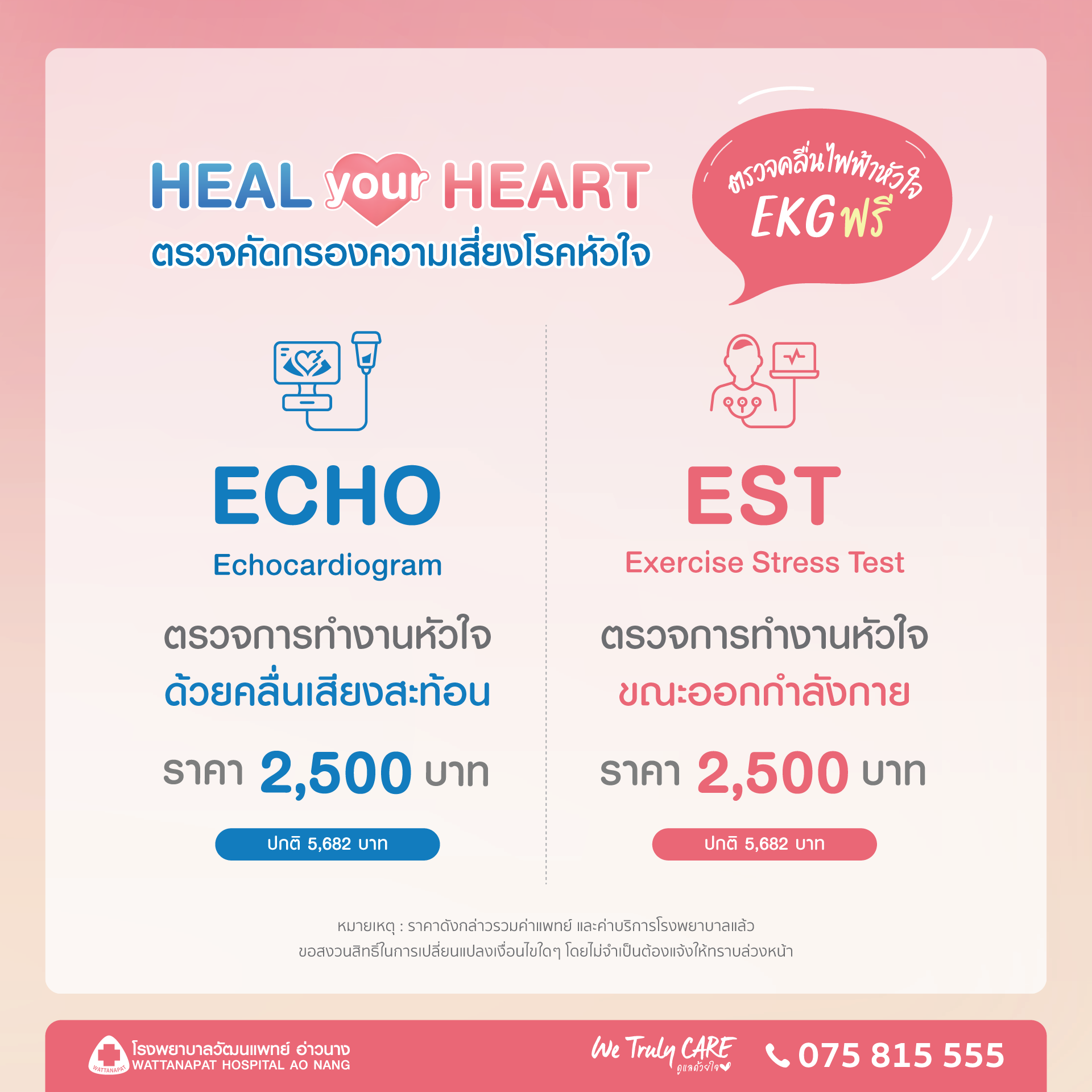 เพราะหัวใจคุณ... สำคัญกับใครหลายคน การตรวจคัดกรองความเสี่ยงโรคหัวใจ ราคาพิเศษเพียง 2,500 บาท ที่โรงพยาบาลวัฒนแพทย์ อ่าวนาง "หัวใจ" คือ เครื่องยนต์สำคัญที่ทำงานหนักที่สุดในร่างกาย การดูแลหัวใจไม่ใช่แค่เรื่องของวัยรุ่นหรือผู้สูงอายุ แต่คือเรื่องของทุกคนที่มีคนที่รักรออยู่ที่บ้าน โรงพยาบาลวัฒนแพทย์ อ่าวนาง ขอส่งต่อความห่วงใยด้วยแพ็กเกจ "Heal Your Heart" ตรวจคัดกรองความเสี่ยงโรคหัวใจแบบเจาะลึก ในราคาที่เข้าถึงได้