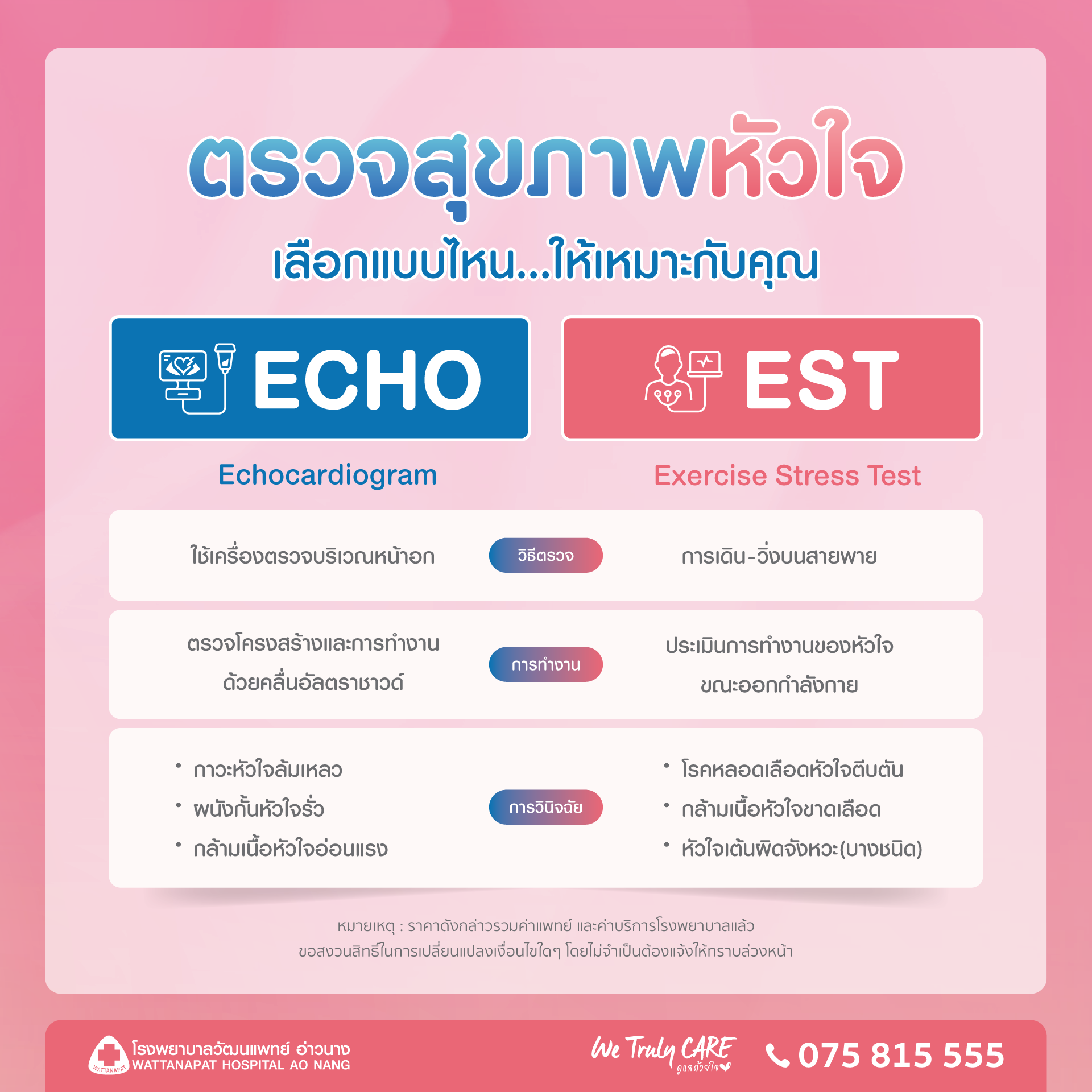 เลือกการตรวจที่เหมาะกับคุณ ( 1 รายการ ) เรามีโปรแกรมการตรวจ 2 รูปแบบ เพื่อประเมินประสิทธิภาพการทำงานของหัวใจที่แตกต่างกัน ดังนี้ :