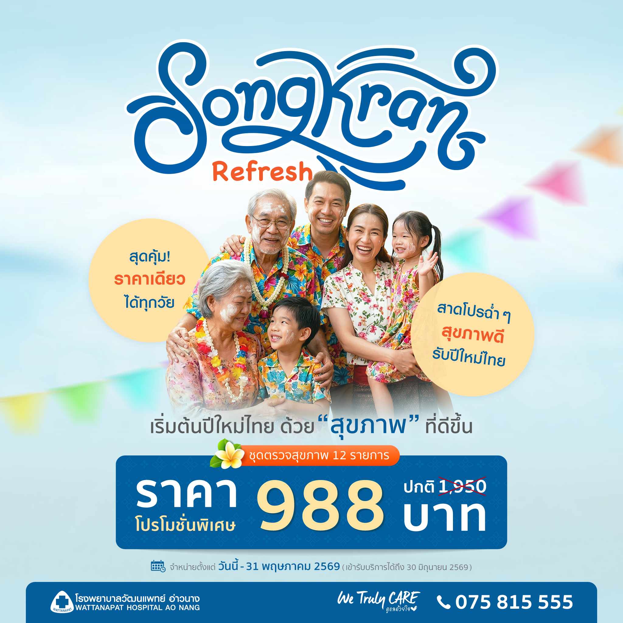 เทศกาลสงกรานต์คือช่วงเวลาแห่งความสุขและการรวมตัวกันของครอบครัว แต่ความสุขที่แท้จริงจะยั่งยืนได้นั้น ต้องเริ่มจากการมี "สุขภาพที่แข็งแรง" ครับ ในปีใหม่ไทย 2569 นี้ โรงพยาบาลวัฒนแพทย์ อ่าวนาง ขอชวนทุกท่านมารีเฟรชร่างกายให้สดชื่น พร้อมลุยทุกกิจกรรมกับแคมเปญ "Songkran Refresh"